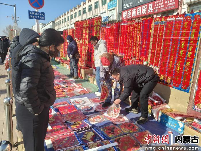 走出商超,街头巷尾更是年味浓郁。沿街的春联、福字、烟花爆竹售卖摊位一字排开,红彤彤的春联、金灿灿的福字、各式各样的烟花爆竹摆满街边,成为冬日街头一道亮眼的风景线。摊主们的吆喝声、市民的询价声交织在一起,奏响了新春的序曲。往来行人手中拎着刚选购的年货,脸上都洋溢着藏不住的幸福笑容。摊主白海勇说:“我们是腊月十二开始出摊的。马年对联和福字卖得比较好,汉语和蒙语都有,大概有150多种。等到腊月二十几的时候,顾客基本上能排满了。”