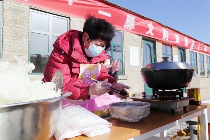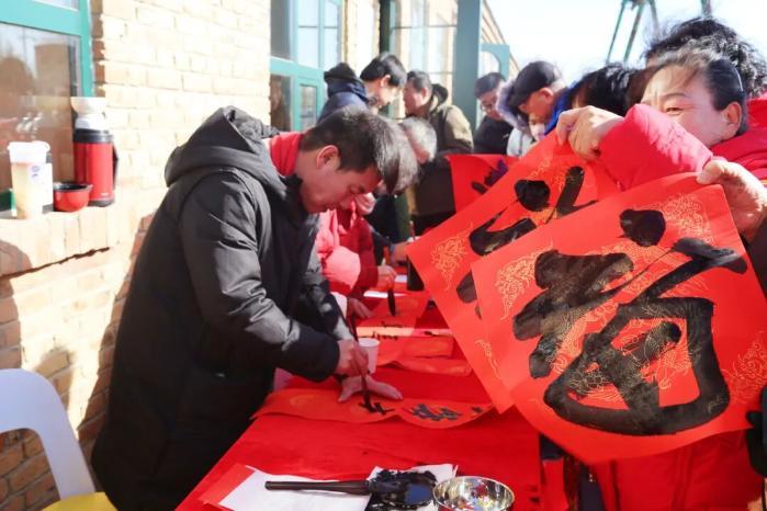 在文化园中央广场,书法家们正挥毫泼墨书写春联。家住附近的王大爷特意带着孙儿前来:“现在都用手机拜年,手写春联才有年味!”他捧着刚写好的对联喜笑颜开。在广场一边正在进行的京绥饺子宴更是热气腾腾、香气四溢,游客们围成一圈一起品尝猪肉馅饺子,现场欢声笑语不断。广场后方的年货节上,红薯、胡萝卜等各类农产品,粉条、豆腐、炸糕等传统年货琳琅满目,摊主们热情吆喝,顾客们提篮选购,烟火气与人情味交织升腾。