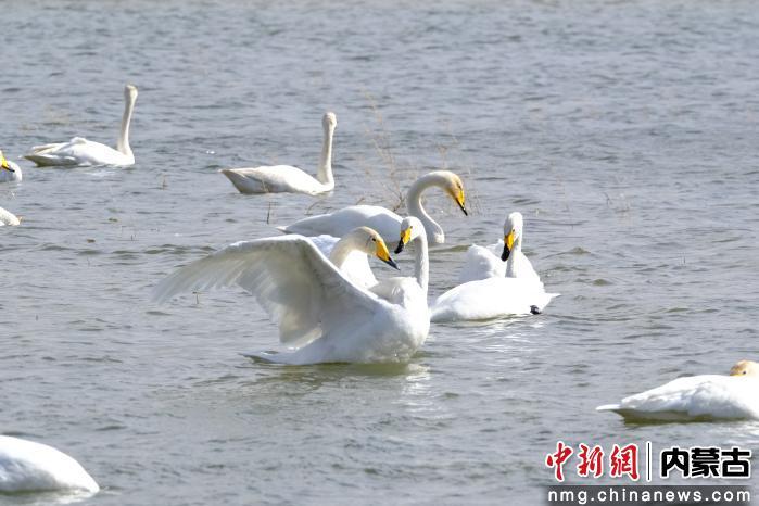 中新网内蒙古新闻3月19日电 (梁佳靓)春日天气转暖,巴林左旗乌力吉沐沦河国家湿地公园迎来北归天鹅。它们在波光粼粼的水面上悠然游弋、相伴嬉戏,为初春的湿地增添了勃勃生机。